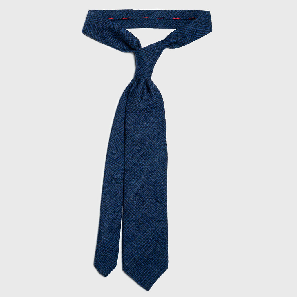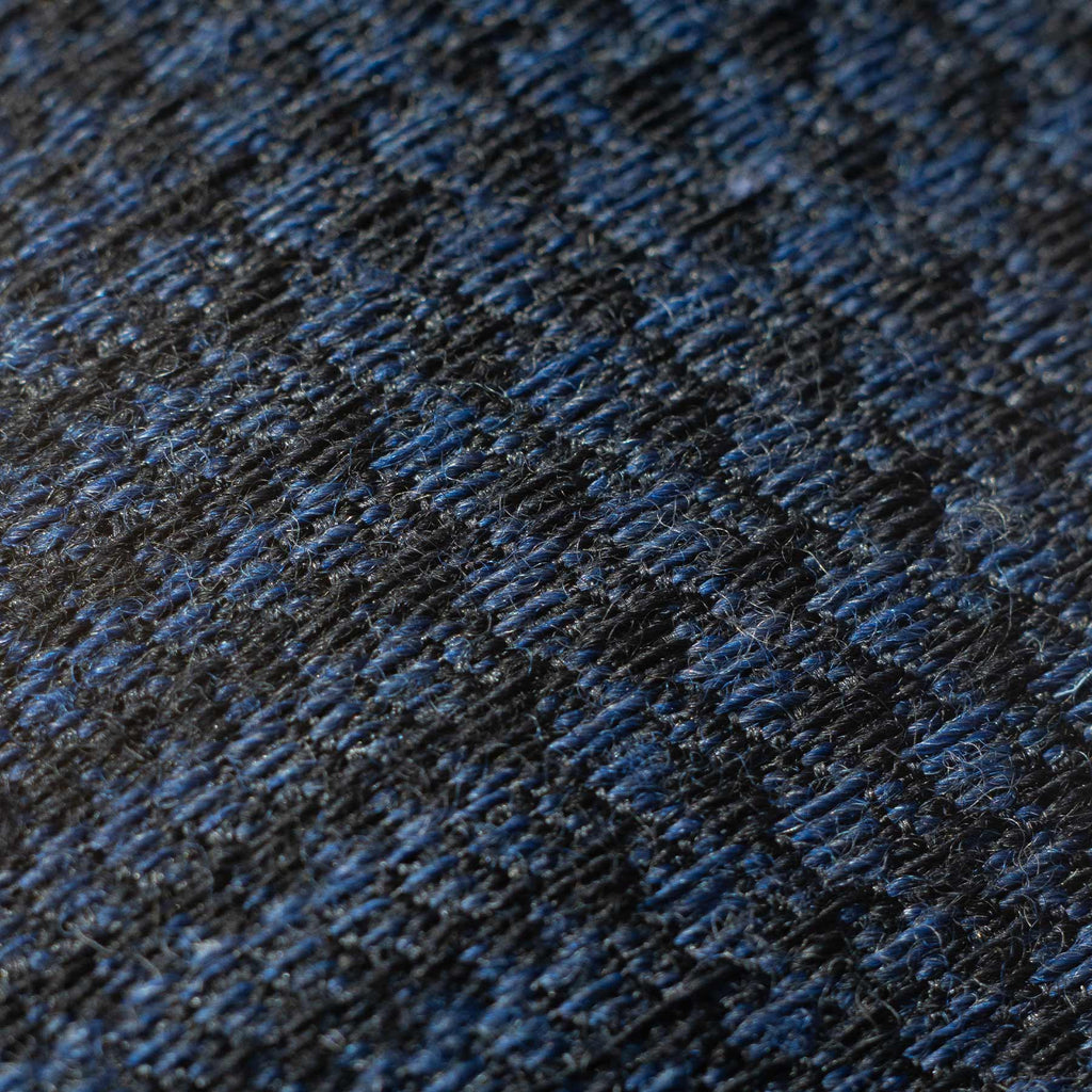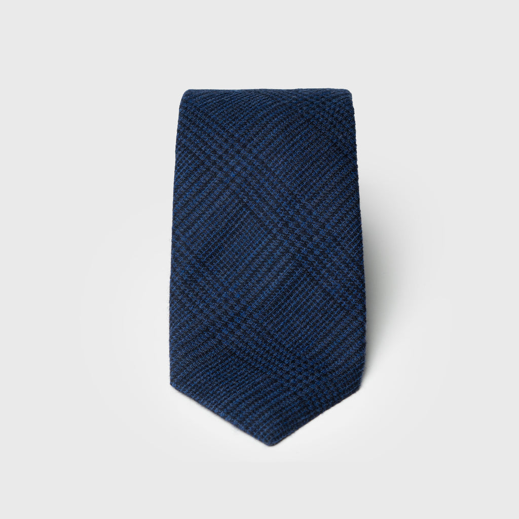 The dark blue ground is overlaid with a black glen plaid pattern, subtle at a distance and richly dimensional up close. The deep navy base and darker plaid work together to create presence without excess.