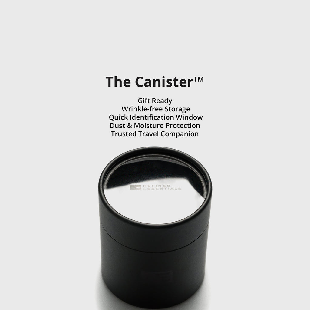 Every tie arrives in the Aklasu Tie Canister™, designed to protect your tie and add a touch of refinement. The canister’s viewing window lets you see which tie is inside without removing the lid, making storage simple and presentation memorable.